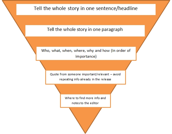 The body of the press release should be written in the “Inverted Pyramid” style, which we also examined earlier this semester. In this style, the most important part of a story and critical details are communicated first. After the most crucial news is presented in the first paragraph, each succeeding paragraph fills in the rest of the story with details and background in descending order of importance.